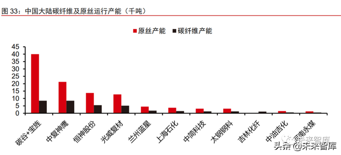 中国大陆碳纤维行业集中度较高,跨越低达产率历史阶段,趋近国际水平。中国大 陆碳纤维及原丝产能集中度较高,主要集中在吉林碳谷、中复神鹰、恒神股份、光威复 材四家制造商,其中吉林碳谷主要研发低成本大丝束碳纤维原丝,产能位居我国首位。