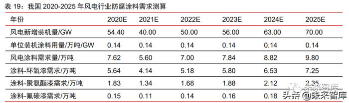 2021-2025 年预计风电用环氧树脂需求将保持高速的增长。风电叶片尺寸增大,其 质量将出现三次方的同步变化,对于基体材料的用量需求将有保障。预计风电叶片专用 环氧树脂受益于风电装机的高景气度将实现稳定的增长。我们以聚合科技招股书(申报 稿)中披露数据计算得到 2018-2020 年我国风电环氧树脂的需求量为 13.9、19.1、35.5 万吨,2020 年因风电装机量的大幅增加,风电环氧树脂需求出现明显的增长。在风电大 型化的趋势下,碳纤维用量提升,在碳纤维高性能的支持下,预计单位装机容量环氧树 脂将持续下降,但随装机量的高速增长,预计环氧树脂需求也将呈现出高速的增长。(报告来源:未来智库)
