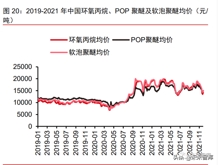 2020 年风电行业需求旺盛,带动聚醚胺以及原材料聚醚的价格提升。聚醚的产品价格与原料 PO(环氧丙烷)直接相关。2020 年在风电抢装潮的带动下,环氧丙烷价格从 2020 年初 9500 元/吨均价攀升至 2020 年 9 月份 19000 元/吨高点,实现翻倍的涨幅,国 内“PO-聚醚-聚醚胺-风电”产业链中聚醚产品同时实现了量价齐升。