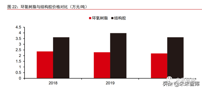 结构胶原材料成本高,技术溢价提升价格。据康达新材年报,结构胶原材料成本占 据 80%以上。风电结构胶技术难度较大,毛利率较高,根据康达新材营收数据进行计算, 2019 年公司环氧胶毛利率为 31.8%,2020 年风电结构胶的平均售价为 4 万元/吨,环氧 树脂均价为 2 万元/吨,具备较好的盈利水平。