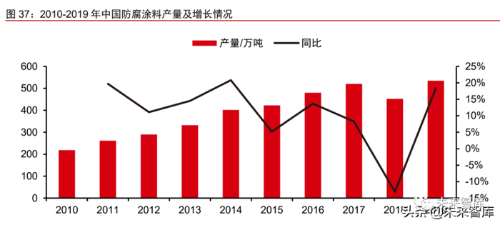 特别是叶片的叶尖 前缘部分比较薄而且线速度大,该部位的腐蚀最为严重。风电叶片前缘出现腐蚀将影响 风电叶片的气动,增加运行阻力,降低发电量,因此对于风电叶片的防护是非常必要的。我国工业防腐涂料产量基本上维持稳定增长。2010-2019 年,中国防腐涂料供给整 体呈现较快增长趋势,仅 2018 年产量有所下滑。2018 年,我国防腐涂料总产量 452 万 吨,占涂料总产量的 25.7%;2019 年,我国防腐涂料总产量 535 万吨,同比增长 18.4%, 占涂料总产量的 22.2%。