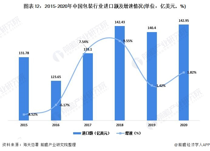 在包装行业进口市场上,2020年包装行业进口额经历了2019年下降后恢复增长。2020年,全国包装行业累计完成进口额142.95亿美元,同比增长1.82%。