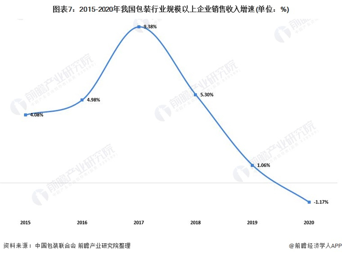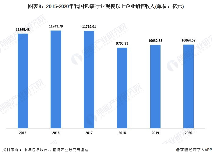 2015-2019年我国包装行业规模保持着增长趋势,但增速有所下降,直到2020年行业规模出现负增长。2020年全国包装行业规模以上企业实现销售收入10064.58亿元,同比下降1.17个百分点。