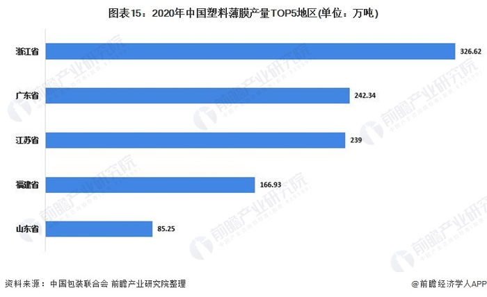 2020年全国塑料薄膜产量排在前五位的地区依次是浙江省、广东省、江苏省、福建省和山东省。其中,浙江省完成累计产量326.62万吨,排在所有省份的第一位。