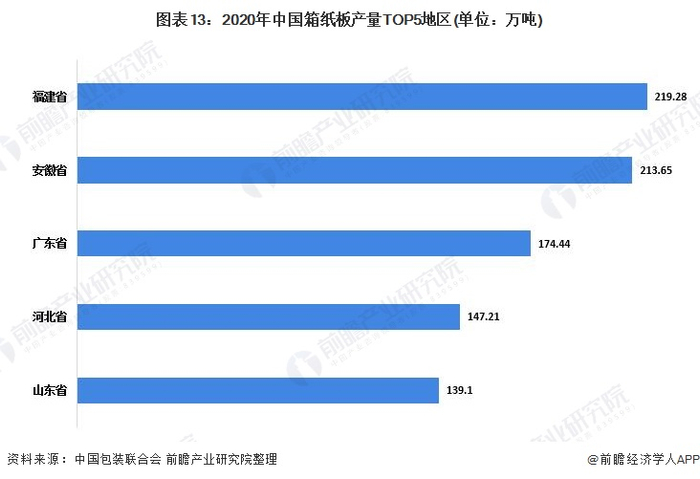 2020年我国箱纸板行业产量排在前五位的地区依次是福建省、安徽省、广东省、河北省和山东省。其中,福建省完成累计产量219.28万吨,占全国总产量的15.72%,同比增长4.5%,产量排在全国首位。