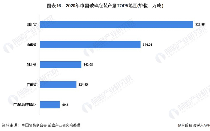 2020年全国玻璃包装产量排在前五位的地区依次是四川省、山东省、河北省、广东省和广西壮族自治区。其中,四川省完成累计产量522.88万吨,排在所有省份的首位。