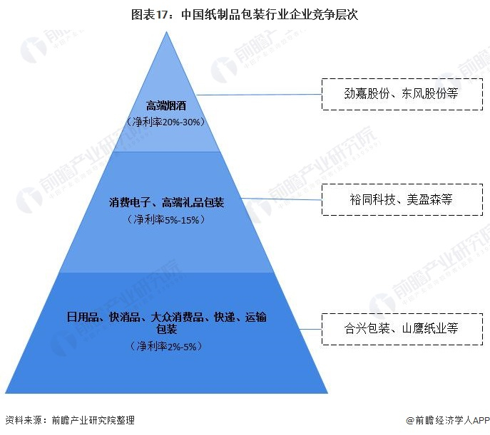 纸包装市场按照利润率和规模体量呈现金字塔状:金字塔最底层的是工业包装及低端商业包装,规模体量最大,原材料以箱板、瓦楞为主,结构简单个性化程度低,多用于低客单价的日用品、快消品、快递包装以及部分高客单价但体积较大的商品(如家电),净利润水平约在2%~5%;中高端商业包装主要以白卡纸、白板纸等材料为主,印刷精美、结构复杂、设计附加值高,主要用于高客单价、小体积的商品,如消费电子、高端白酒、精品烟盒、高端礼品,其中消费电子包装净利率多在5%~15%,烟酒包装净利润率可达20%~30%。