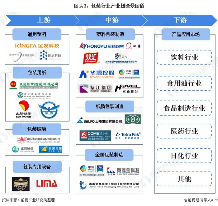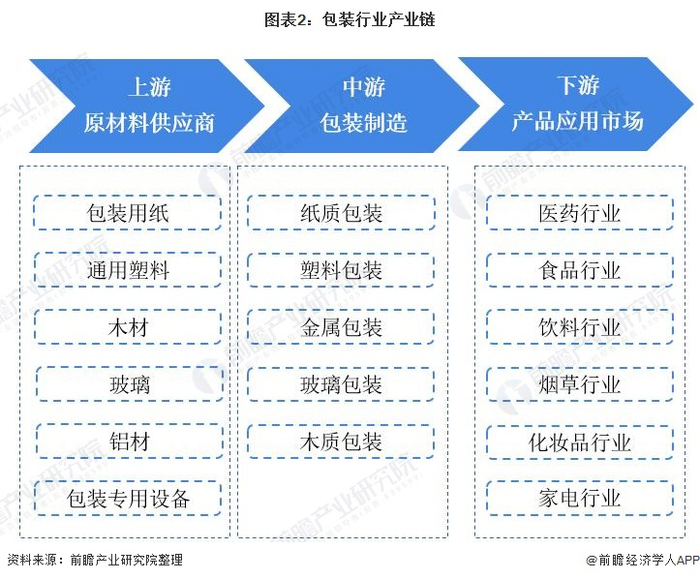 包装行业产业链上游为原材料及设备供应商,包括包装用纸、通用塑料、木材、玻璃、铝材和包装机械等;中游为包装制造行业,包括纸质包装、塑料包装、金属包装、玻璃包装和木质包装;下游为包装产品应用市场,包装行业下游应用市场广泛,主要包括医药行业、食品行业、医疗行业、烟草行业等。中国包装行业产业链如下: