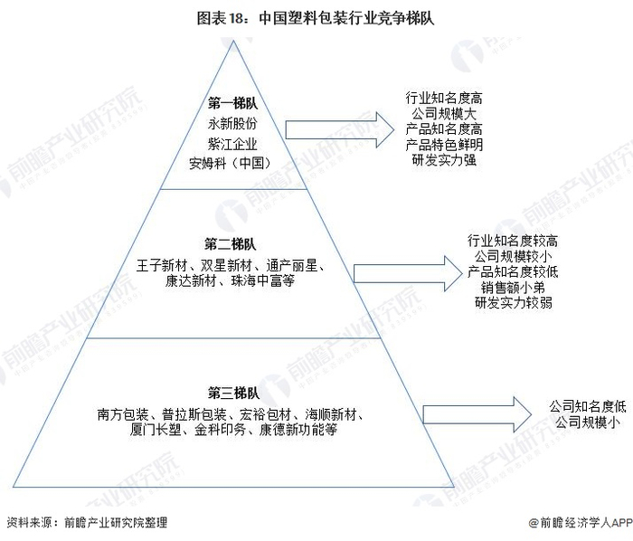 我国塑料包装行业大体可以分为四个梯队,第一梯队为龙头型企业,主要有永新股份、安姆科(中国)、紫江企业等,营业收入在20亿元以上,塑料包装相关板块业务在20亿元以上;第二梯队为行业内主要竞争者,主要有通产丽星、王子新材、珠海中富等营收在10亿元以上,塑料包装相关板块在5亿元以上的企业;第三梯队为行业中坚力量,主要为南方包装、普拉斯包装、宏裕包材、海顺新材等大中型企业,此梯队企业数量最多,也更有可能出现新的龙头企业;第四梯队为广大中小企业,产品偏向中低端,企业规模较小,竞争力较弱。
