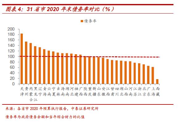 部分地区显性债务压力值得关注。随着地方政府法定债务“前门”越开越大,部分地区显性债务压力快速攀升。从“负债率”“债务率”“偿债率”等指标看,部分地区已经超出警戒线。根据我们测算,2020年末我国地方政府债务率约为97%,今年底可能突破100%,整体债务风险需要引起重视。分区域看,部分地区债务风险较高,2020年末有17个省市债务率超过100%,其中天津最高(183.5%)。