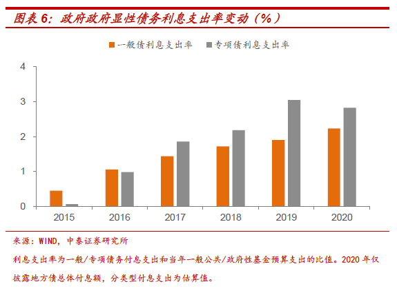 从债务付息支出占比指标看,地方显性债务风险整体可控。我们根据财政部披露数据,梳理了近年来地方政府偿还显性债务的利息支出,并计算其相对于预算支出的占比。以2020年为例,一般/专项债务付息支出占当年一般公共/政府性基金预算支出的比重均不超过3%,距离10%的红线仍有较大空间。