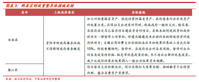 按照《文件》政策要求,实施财政重整的地区,首先得压缩开支,减少建设性支出,通过“紧衣缩食”将节省下来的资金用于还债,其次要处置国有资产,最后才是申请上级政府救助。因此,安岳县、雁江区的财政重整计划也是按照上述原则制定。