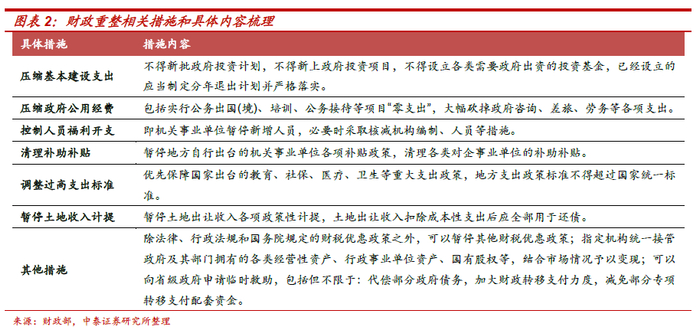 财政重整本质就是“压减非刚性支出、偿债优先”。财政重整期内,除必要的基本民生政策支出和政府有效运转支出外,视债务风险等级,本级政府其他财政支出应保持“零增长”或者大力压减。具体包括“压缩基本建设支出”“压缩政府公用经费”“控制人员福利开支”“清理补助补贴”“调整过高支出标准”“暂停土地收入政策性计提”等六个方面。此外,地方政府可以暂停财税优惠政策,并通过处置政府资产、申请省级救助等方式增加偿债资金来源。