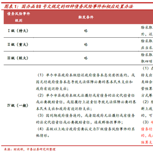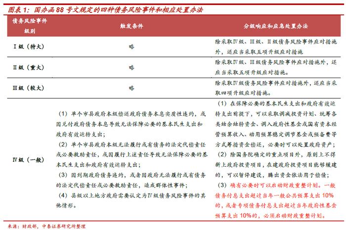 “财政重整”:88号文的引入。“财政重整”一词源于2016年的国办函88号文(以下简称《文件》)。该文将地方政府性债务风险事件分为四个等级,并设立分级响应和应急处置机制。市县债务管理领导小组或债务应急领导小组认为确有必要时,可以启动财政重整计划;另外如果一般/专项债务付息支出超过当年一般公共/政府性基金预算支出10%,必须启动财政重整。