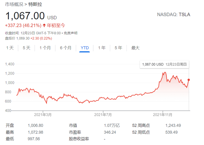 至于去年暴涨656%的特斯拉,尽管风波不断,但乘着新能源汽车概念的东风依旧表现亮眼,今年迄今上涨逾46%。不过年末马斯克的一波“卖股套现”操作,属实是让市场大吃了一惊,导致股价大跌,市值也一度跌破1万亿美元。幸好后来马斯克下场表态“卖够了”,再加之特斯拉因环保审批未通过而停滞许久的柏林超级工厂项目传出好消息,股价实现三连涨,市值才重回1万亿美元上方。