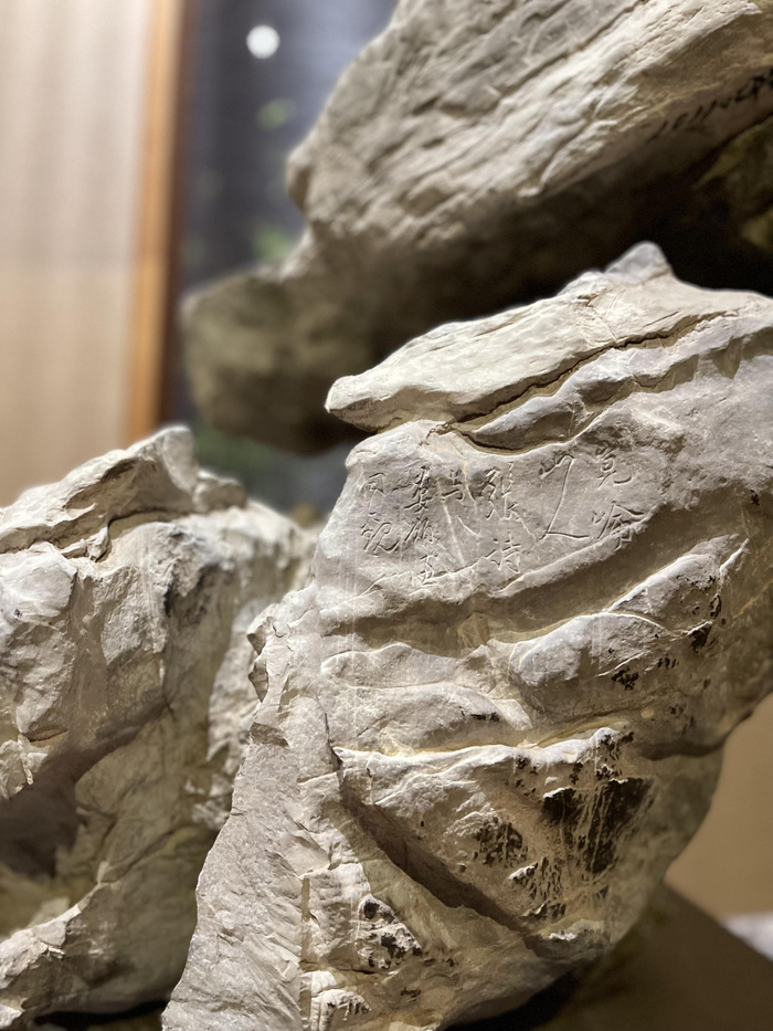 地处地下一层展览入口处的焦点是故宫具有传奇性的赏石——故宫收藏的唯一一块有确切题刻的元代赏石,也是元代文人赏石朋友圈的“活化石”——“造云”铜变石。