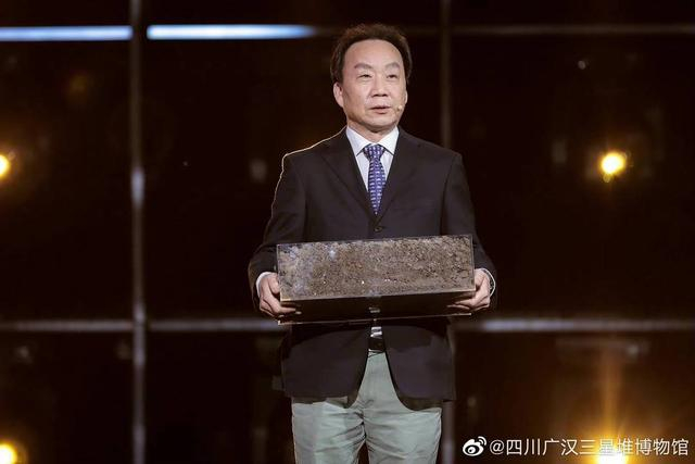 此外,三星堆博物馆馆长雷雨携三星堆出土的青铜太阳轮登台,他还手捧存放着三星堆遗址土壤的盒子,向全世界观众发出“长江文明源,三星伴月出。三星堆博物馆携青铜太阳轮与您共同见证‘何以中国’”的邀请宣言。