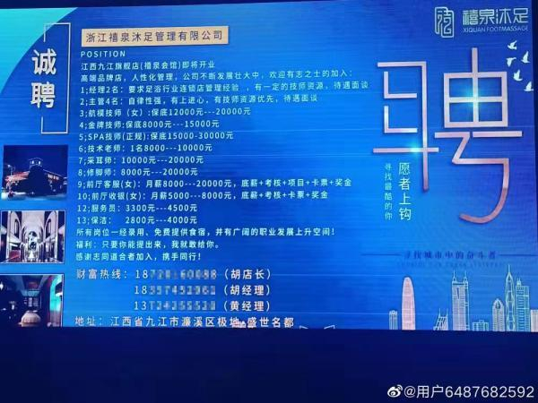 据梁先生提供的图片,该招聘公告发布方为浙江禧泉沐足管理有限公司,称江西九江旗舰店(禧泉会馆)即将开业,诚聘13个岗位工作人员,其中包括“航模技师(女)”“金牌技师”“SPA技师(正规)”等。