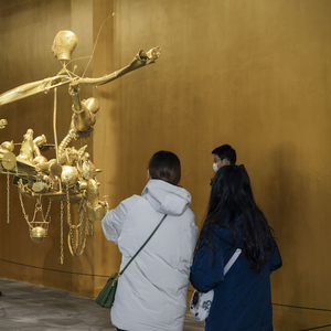 “年鉴展2020”展览现场,观众正在看童昆鸟作品《三毫米上的金色恶托邦》