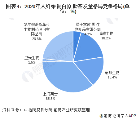 人纤维蛋白原市场中,上海莱士、派斯菲科、博雅生物排名前三,2020年批签发量情况依次为:上海莱士49.1万瓶,占比为36.3%;哈尔滨派斯菲科生物制药股份有限公司为31.56万瓶,占比23.33%;博雅生物为24.59万瓶,占比为18.18%。