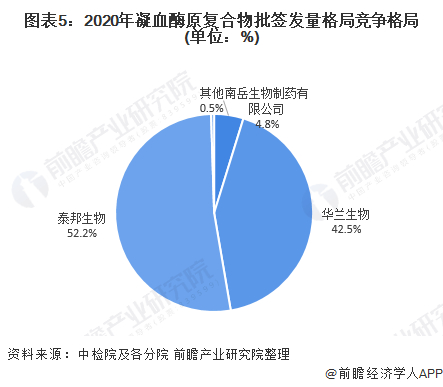 人凝血酶原复合物行业两大巨头为华兰生物和山东泰邦生物制品有限公司,2020年批签发情况为:华兰生物工程股份有限公司为69.32万瓶,占比为42.5%;山东泰邦生物制品有限公司为85.10万瓶,占比为52.2%。