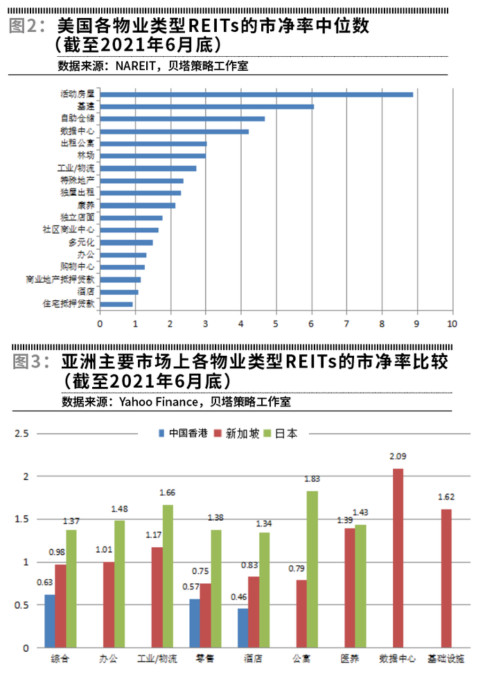 综合来看,同美国市场一样,在亚洲市场上,与网络科技相关的数据中心、基础设施、工业/物流地产类REITs,以及日本市场上的公寓类REITs的市净率估值都较高,而酒店和零售类REITs的市净率则较低。