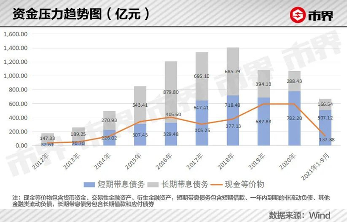 2017年泛海控股的偿债压力首次明显展露,当年年末,账面现金等价物首次大幅度低于一年内到期的带息债务,缺口高达342亿元,自此始终维持不小的资金“窟窿”。