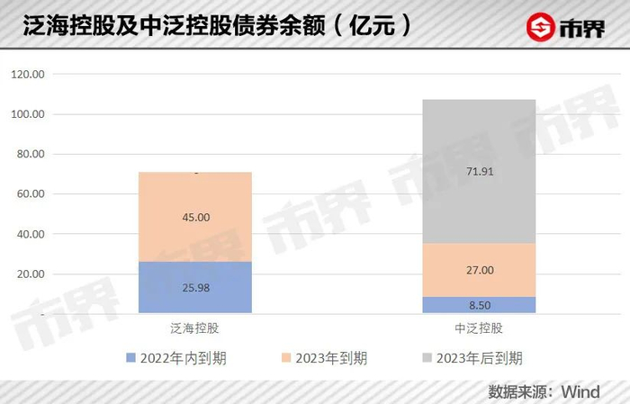 Wind数据显示,泛海控股和中泛控股作为主要的两个发债主体,目前存续债券余额分别为70.98亿元和107.41亿元,其中泛海控股所有债券将在2023年底前到期。
