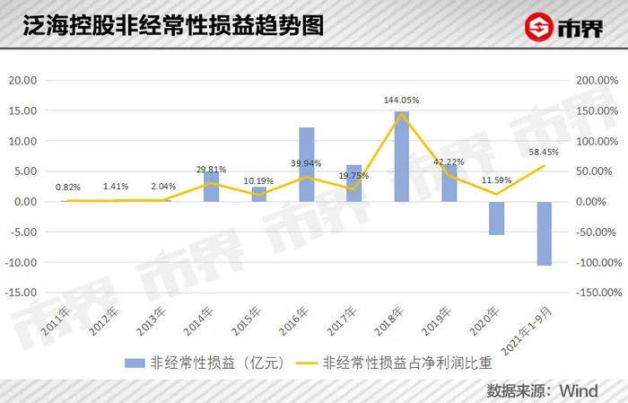 2020年和2021年前三季度,非经常性损益反过来成为泛海控股亏损的重要原因,占比分别为12%和58%。