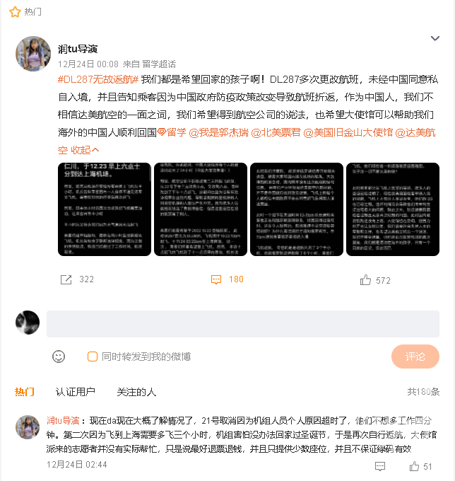 我们留意到,当地时间23日晚上,当天的DL287也取消了,上面也是很多中国人,上百人。