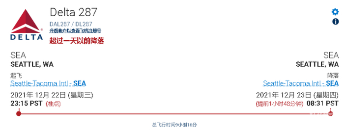 这次回家的航班,是美国的达美航空。原定当地时间12月21日22:59(北京时间12月22日14:59),从西雅图塔克马国际机场起飞。