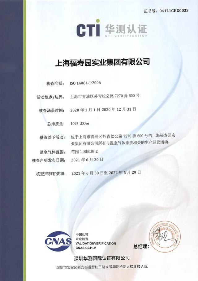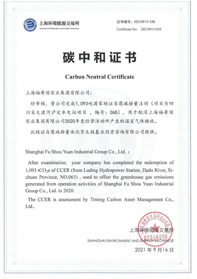 2021年5月,上海福寿园自愿碳中和项目正式立项试点,此次碳中和项目依据《中国自愿碳减排标准》实施,由第三方认证机构深圳华测国际认证有限公司核查主要耗能情况、节能减排措施、车队用油量等共计30项内容,统计确认2020年度上海福寿园共排放1093 吨二氧化碳。随后,根据《中国自愿碳减排标准》在上海环境能源交易所登记注册核销中心登记的“四川省大渡河泸定水电站项目”产生的“温室气体减排量”(CCER)进行减排量核销登记,抵消上海福寿园企业排放的1093吨二氧化碳。