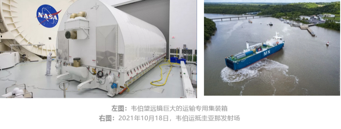 最后,由于发射场位于南美洲,把望远镜从美国千里迢迢运输到发射场要16天的时间,同时还有一个最大的威胁等着他们——海盗。海盗大概不会忽略这一块价值100亿美元的肥肉,很可能将运输船劫持。这并非空穴来风,早在1982年一台名叫JCMT的望远镜就在运到英国的路上被劫持了。为了应对此事,NASA始终对韦伯的具体运输日期缄口不言,同时叫来美国海军保驾护航。韦伯望远镜最终于2021年10月18日安全运抵法属圭亚那库鲁航天中心,并将发射日期定为2021年12月18日。