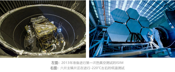 2012年到2014年,四款科学载荷依次完成生产,共同组装为综合科学仪器模块(ISIM)并进入测试环节,在戈达德太空环境模拟器中进行了数次低温测试及真空测试。2015年,主镜的18片六边形镜片全部完成生产。2016年底,整部望远镜的主要结构均完成了生产,随后便是漫长的振动、低温等测试环节。2017年,光学望远镜模块整体进行了长达100天的低温测试,以确保其所有系统在类似的太空环境中能够正常运行。