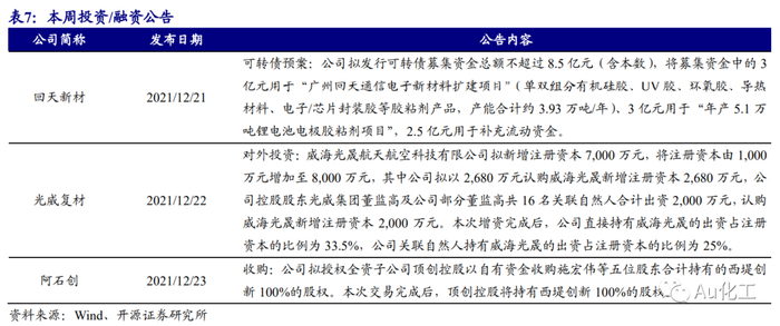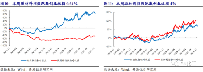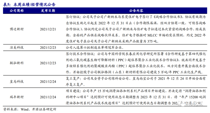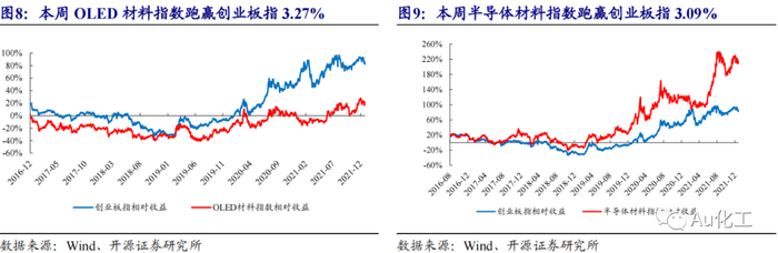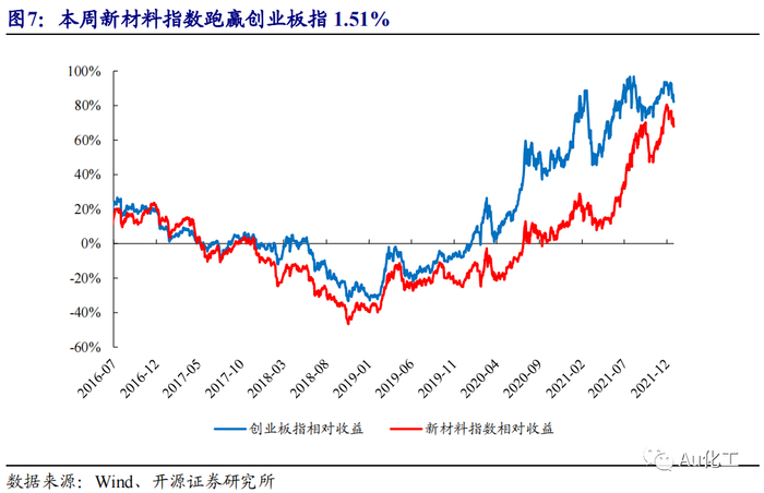 新材料指数下跌2.49%,表现强于创业板指。截至本周五(12月24日),上证综指收于3618.05点,较上周五(12月17日)下跌0.39%;创业板指报3297.11点,较上周五下跌4%。新材料指数下跌2.49%,跑赢创业板指1.51%;OLED材料指数下跌0.72%,跑赢创业板指3.27%;半导体材料下跌0.91%,跑赢创业板指3.09%;膜材料指数下跌3.36%,跑赢创业板指0.64%;添加剂指数上涨0%,跑赢创业板指4%;碳纤维指数下跌6.04%,跑输创业板指2.04%;尾气治理指数下跌0.08%,跑赢创业板指3.92%。