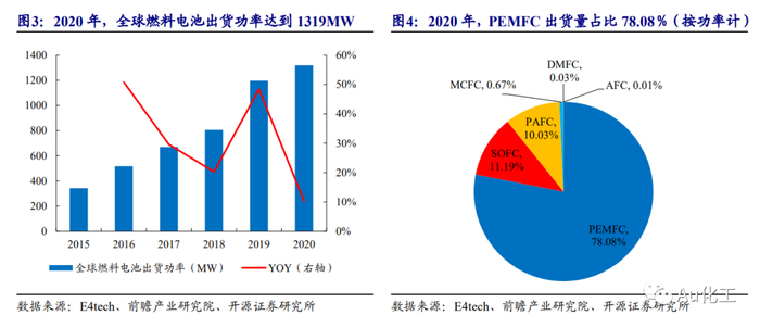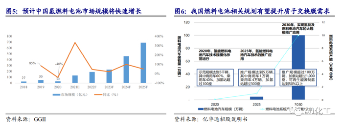 全球燃料电池出货量攀升,国内氢燃料电池产业规划有望带动质子交换膜需求大幅提升。根据E4tech和前瞻产业研究院数据显示,全球燃料电池出货量由2012年的4.6万套增长至2020年的8.2万套,出货量规模增长明显;从出货功率来看,2020年尽管受新冠肺炎疫情的影响,但在亚太地区的拉动下,全球燃料电池出货功率仍然保持增长态势,达到1319MW,同比增长10.28%,其中PEMFC出货量占比78.08%,是目前全球最主要的燃料电池类型;从应用领域来看,固定电站和交通运输是燃料电池的主要市场,2020年固定电站燃料电池出货量达到5.3万台,占总出货量的比重为64%;交通运输领域出货量2.55万台,占比为31%;但从装机量来看,交通运输燃料电池装机量超1000MW,占比超过70%。GGII数据显示,2019-2020年中国氢燃料电池产业市场规模分别为50亿元、30亿元,随着加氢站网络初步形成,氢燃料电池产业趋于完善,氢燃料电池系统成本下降,下游应用增多,预计到2023年中国氢燃料电池产业市场规模将达到230亿元,2019-2023年CAGR高达46%,质子交换膜作为燃料电池的关键部件,需求量有望随之增长。