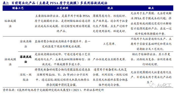 全氟磺酸质子交换膜商业化应用广泛,性能提升、制备工艺仍是重点研究方向。为满足质子交换膜的性能要求,现有研究主要围绕磺化聚合物开展,并通过引入无机填料进行杂化或与其他聚合物复合的方式来进一步提升性能。根据聚合物基体的不同,质子交换膜主要分为全氟磺酸(PFSA)质子膜、部分氟化聚合物质子膜和非氟化聚合物质子膜三大类。PFSA质子交换膜最早由杜邦公司于20世纪70年代开发并实现商业化生产(Nafion系列,后分拆出科慕公司负责生产),其技术成熟、性能优良,是目前应用最广泛的质子交换膜体系,但也存在高温下易降解、低湿度下质子电导率低、成本高等问题。为解决上述问题,需要对PFSA质子膜进行杂化改性处理,比如使用膨胀聚四氟乙烯微孔膜(ePTFE)作为增强材料与PFSA复合以降低成本,引入二氧化硅、二氧化钛等无机填料提升PFSA质子膜在高温或低湿度条件下的性能等。此外,制膜工艺也直接影响质子膜的微观结构,进而决定制品的最终性能。质子交换膜的制备工艺可以分为熔融成膜法和溶液成膜法两大类,溶液成膜法是目前科研和商业化产品采用的主流方法。溶液成膜法根据后段工艺的差别可以进一步细分为溶液浇铸法、溶液流延法和溶胶-凝胶法,目前商业化产品(主要是PFSA质子交换膜)多采用溶液流延法。