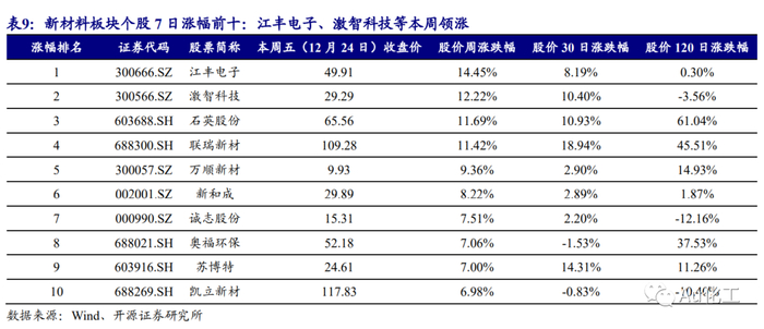 本周(12月20日-12月24日)新材料板块的122只个股中,有45只周度上涨(占比36.89%),有76只周度下跌(占比62.3%)。7日涨幅前五名的个股分别是:江丰电子、激智科技、石英股份、联瑞新材、万顺新材;7日跌幅前五名的个股分别是:永太科技、福斯特、银禧科技、康达新材、联泓新科。