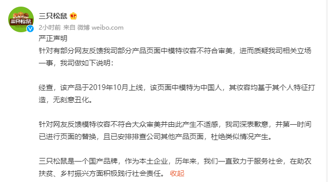 针对有部分网友反馈我司部分产品页面中模特妆容不符合审美,进而质疑我司相关立场一事,我司做如下说明:经查,该产品于2019年10月上线,该页面中模特为中国人,其妆容均基于其个人特征打造,无刻意丑化。