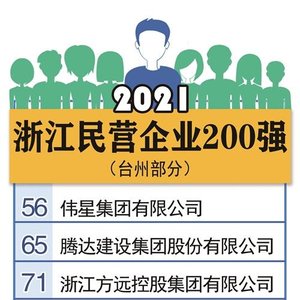 今年的浙江民营企业200强,分布在浙江全省10个市61个县(市、区),台州有14家企业上榜民营企业200强,营业总额为2652亿元,数量居全省第五。其中,伟星集团有限公司、腾达建设集团股份有限公司、浙江方远控股集团有限公司、国强建设集团有限公司、天颂建设集团有限公司、公元塑业集团有限公司等6家企业排进前100强。