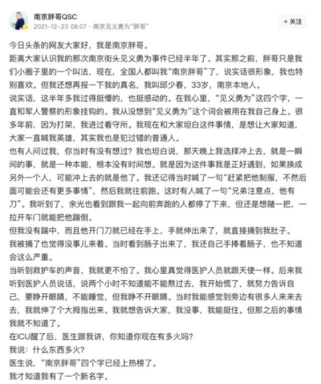 12月23日,南京胖哥发文回忆救人瞬间:我被捅了也觉得没事儿来着。当时看到肠子出来了,我还自己手捧着肠子,也不知道会这么严重。当听到救护车的声音,我就更不怕了。