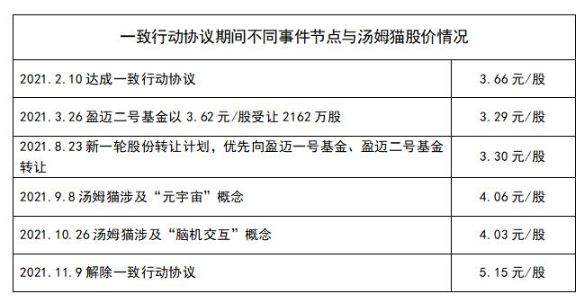 11月19日,汤姆猫公告称,金科控股与两支基金解除一致行动关系,原因是两支基金的管理人员和主要股东发生变更,原先倡导长期投资和价值投资策略的管理团队退出,经营理念和投资策略有较大改变。