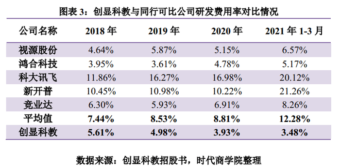 具体来看,在同行可比公司中,科大讯飞的研发费用率约为创显科教的4―5倍;新开普也达创显科教的2倍以上;就算是2018年和2019年研发费用率稍低的鸿合科技,该公司在2020年以及2021年一季度的研发费用率也迅速赶超了创显科教。