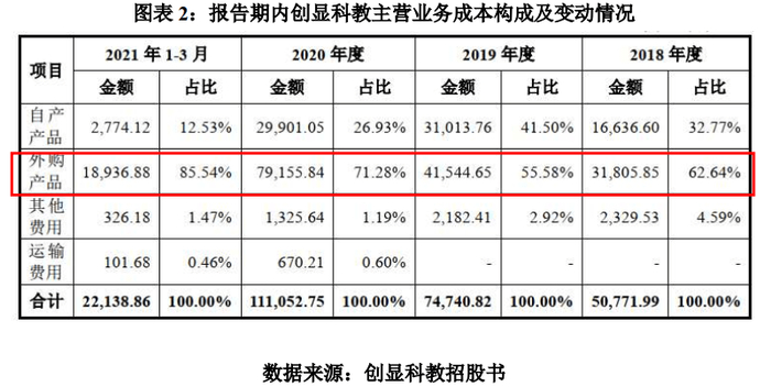小编注意到,创显科教的产品目前仍主要是以外协加工为主。根据主营业务成本构成分析,2018年~2020年三个完整年度内,其外购产品成本占比分别是62.64%、55.58%以及71.28%。