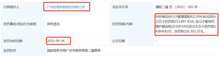 此外,创显科教存在一起税务处罚。2021年9月14日,创显科教因少缴增值税422,994.86元,少缴城市维护建设税29,609.64元,上述两项少缴税金额被国家税务总局广州市税务局第二稽查局处以百分之五十的罚款,合计罚款226,302.25元。