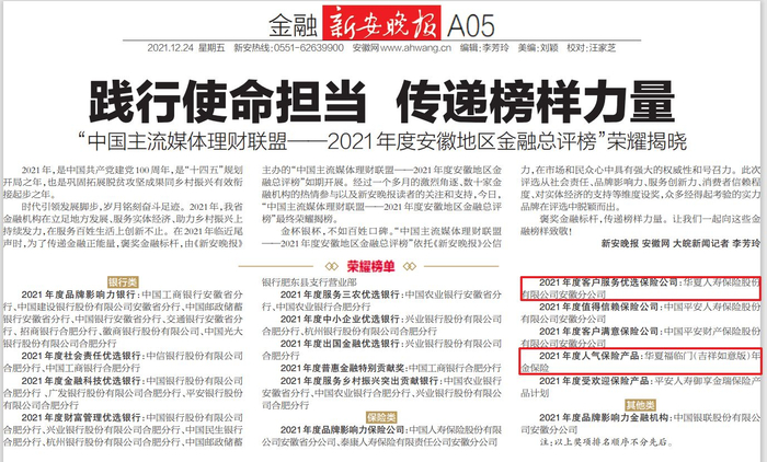 金杯银杯,不如百姓口碑。12月24日,新安晚报《中国主流媒体理财联盟——2021年度安徽地区金融总评榜》荣耀揭榜,华夏人寿安徽分公司获 “2021年度客户服务优选保险公司”称号,营销渠道《华夏福临门(吉祥如意版)年金保险》赢得“2021年度人气保险产品”荣誉。