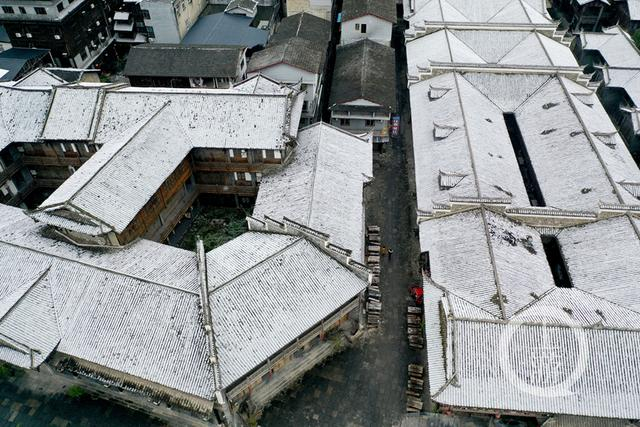 连日来,当地出现雨雪天气,白雪掩映古镇,犹如水墨画。