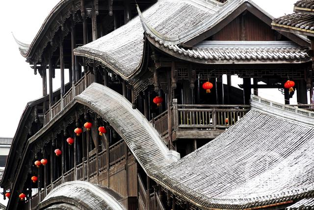 12月27日,黔江区,白雪掩映下的濯水古镇,好似一幅冬季别样山水画卷。