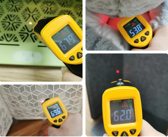 由于暖脚产品是贴身使用的,我们分别测试了5款暖脚产品在最高档位时的温度,有4款温度都在50℃至70℃间。
