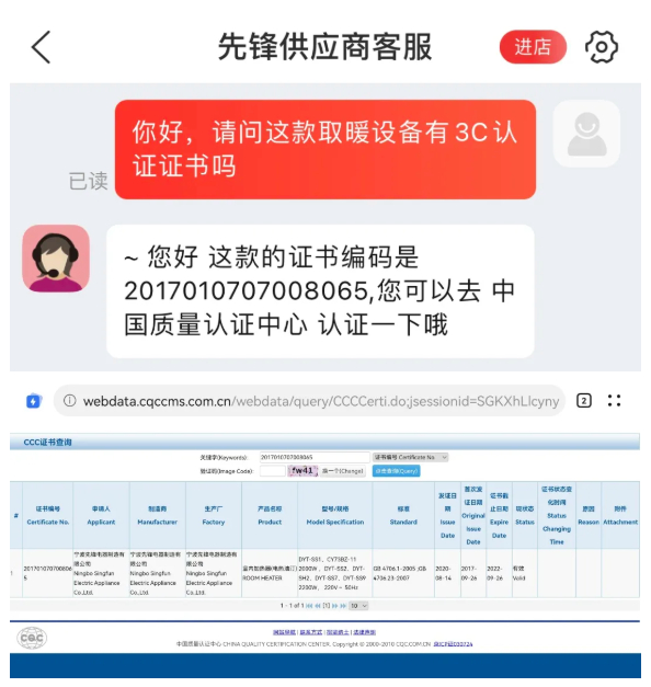 我们购买的小熊、大宇、先锋等品牌都有3C认证,先锋的客服主动亮出了证书编号,Coplex、小熊等直接给出证书原件,我们也在“中国质量认证中心”官网上查到了相应的备案信息。